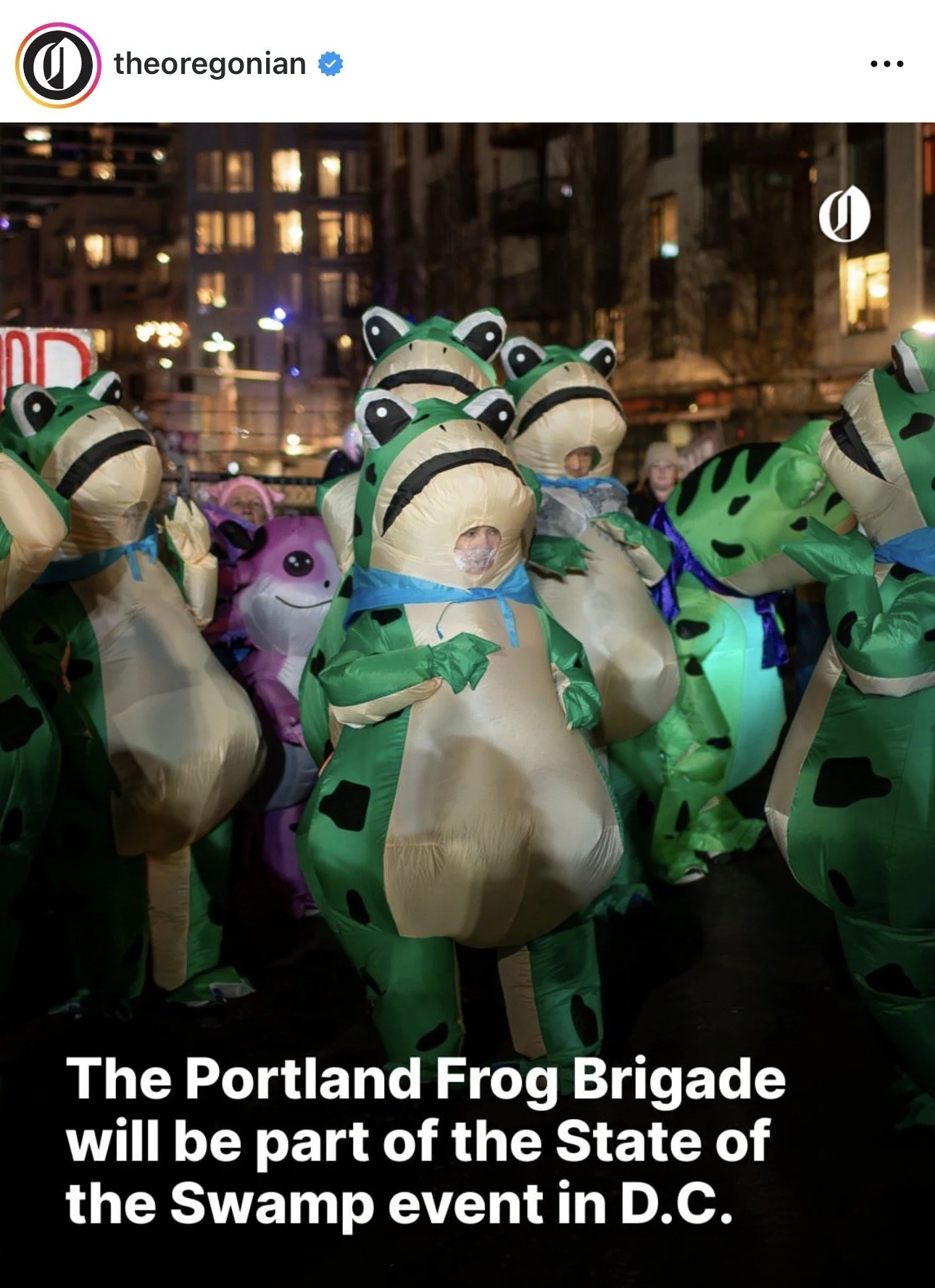 As journalist Jeet Heer points out, this administration wants us to be afraid. It is their goal to make us so afraid that we become numb, then incapacitated. Portland’s response to that has been a training ground for dealing with conservatives. We must remember that the conservative mind does not get humor; Trump and his cronies don’t find anything funny that is not demeaning. So unless they’re making fun of someone, they can’t understand humor. The response from Portland to the constant attempts to invoke violence has been people turning up in the streets and dancing in full-body costumes like frog suits. When Kristi (dog-shooting’) Noem gathered with ICE agents on the roof of the ICE building in Portland, aiming rifles at the protestors, they turned up the music and boogied down. The Trump Gestapo wants violence; instead, they got Portland. Remember, this is the city whose motto is, “Keep Portland Weird”; why would the Trump Administration expect anything less? Have a listen to this song: Laugh at them… laughter drives them crazy!