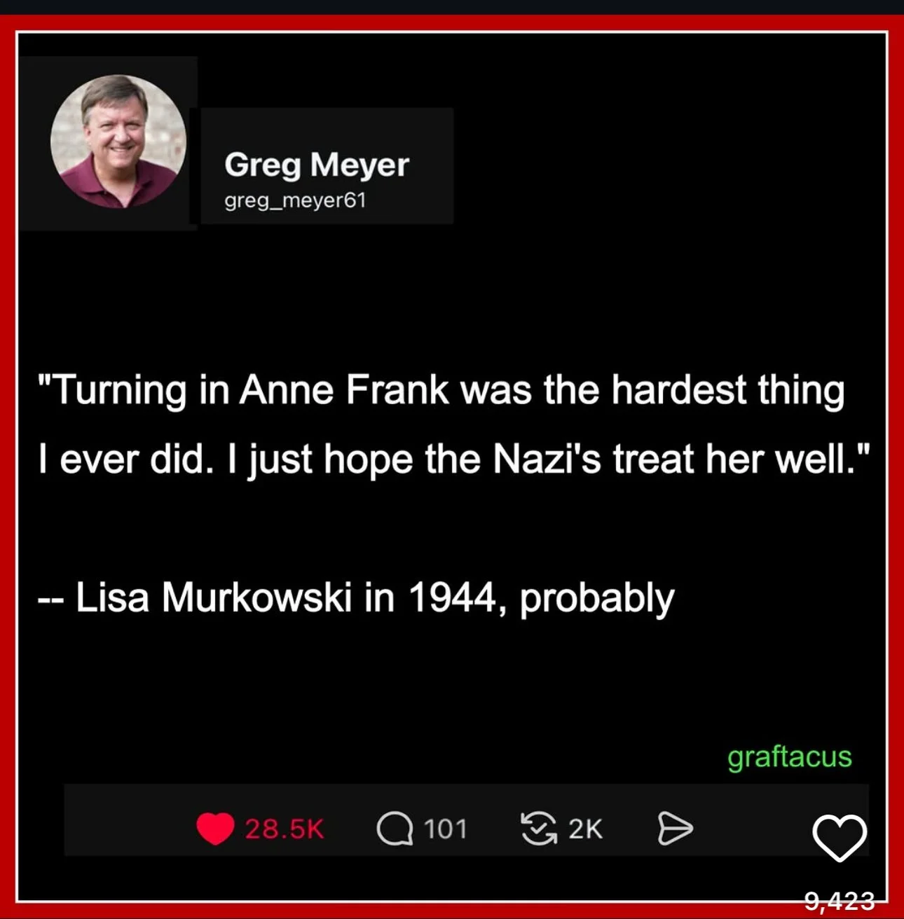What’s the first lie of being a Republican? “We represent you…” The truth is, they represent those with wealth and, increasingly, they represent President 47 and Project 2025. That translates into rights for white males, conservative evangelism, and the richest of the rich. The hypocritical pronouncements of Josh Hawley and Lisa Murkowski face the light of day this week. The gross grifting of Elon Musk, Stephen Miller, Ron DeSantis, and Kristi Noem is all on display for your viewing disgust. Along with their President, they have taken grift to a new level, and this OBBB will lock in their graft for generations to come. Disgusting…